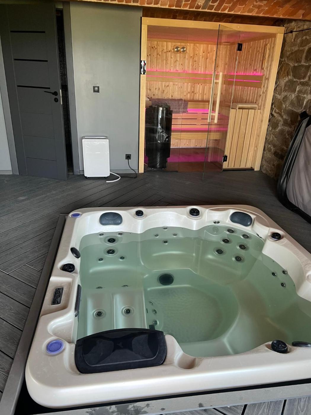 Dom wakacyjny. This holiday home boasts a hot tub, sauna and fireplace. Featuring a private entrance, this air-conditioned holiday home consists of 1 living room, 2 separate bedrooms and 3 bathrooms with a shower and a bidet. Guests will find a stovetop, a refrigerator, a dishwasher and kitchenware in the well-equipped kitchen. The holiday home also offers a barbecue. The spacious holiday home provides a flat-screen TV with streaming services, a washing machine, a tea and coffee maker, a seating area as well as lake views. The unit offers 4 beds. Dom wakacyjny - 6 osobowy. Powierzchnia pokoju ok.: 150 mkw.